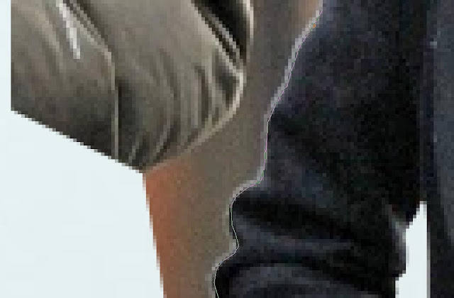 The trick is to trace slightly "inside the lines". If you look at the border between the model its background, there isn't a clear cut-off between, say, shoe and concrete (see the image below). There are usually a few pixels of a blurred intermediate colour (in the case below, a few pixels of darkish grey between the black of Emma's shoe and the light grey of the concrete).